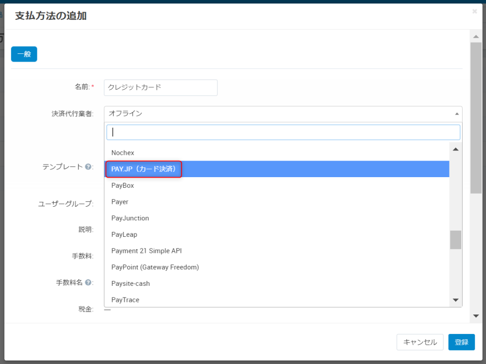 画面右上の+ボタンをクリックすると支払方法の追加画面が表示されます。