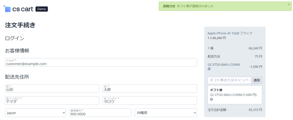 「カートの内容」ページまたはご注文手続き画面の「注文の概要」でギフト券コードを入力することにより、ギフト券を利用することができます。