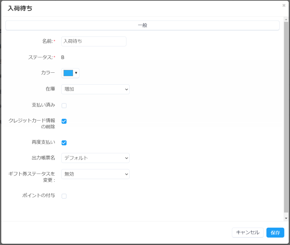 | ポイントの付与 | チェックするとこのステータスになった際にポイントをお客様に付与します。※ポイントアドオン有効時。 |