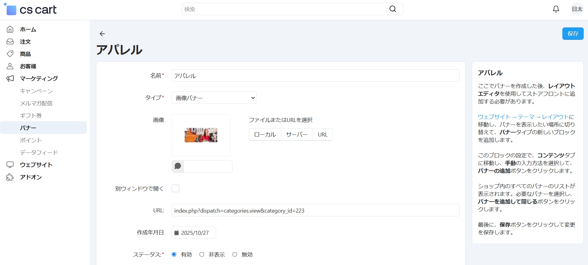 ショップページに表示するバナーを管理します。 画像だけではなく、テキストのバナー(リンク)も作成することができます。