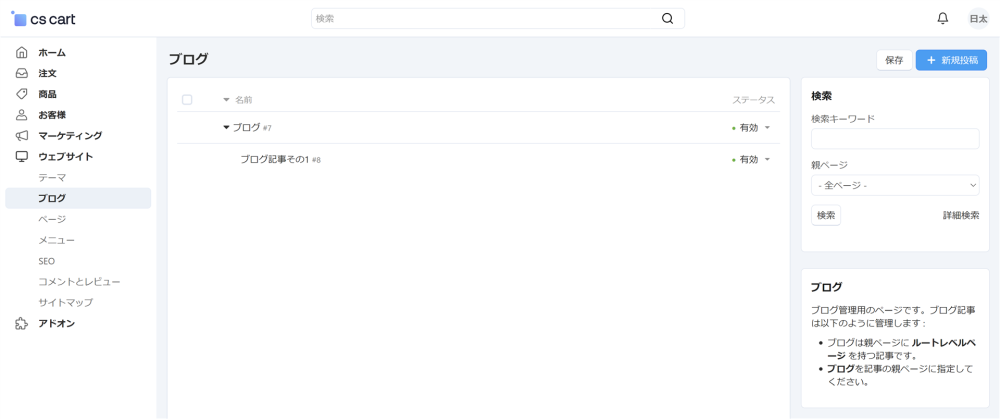 ウェブサイト → ブログ より、ブログの一覧画面が表示されます。