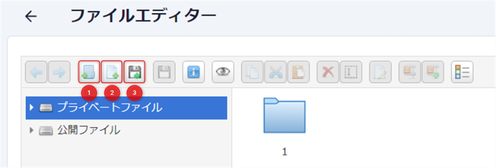 ②…新規ファイル追加ボタン(ファイルエディター上に直接新規テキストファイルが作成されます)