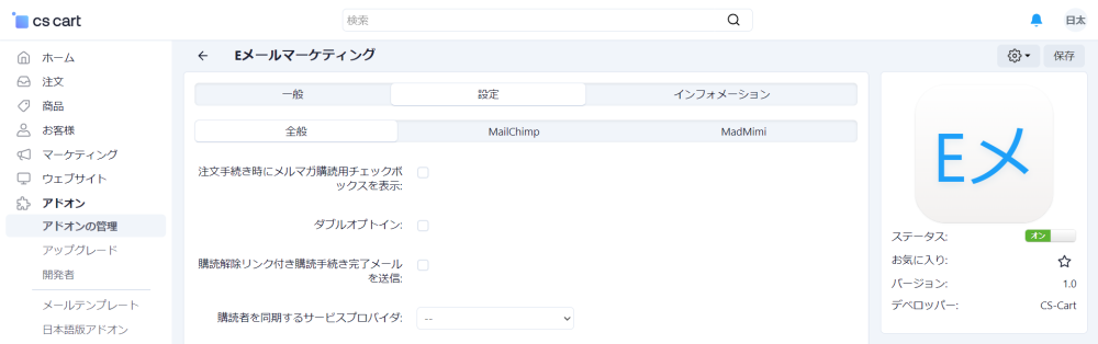 管理画面の アドオン → アドオンの管理 にアクセスし、「Eメールマーケティング」アドオンの名前をクリックして設定画面を開きます。