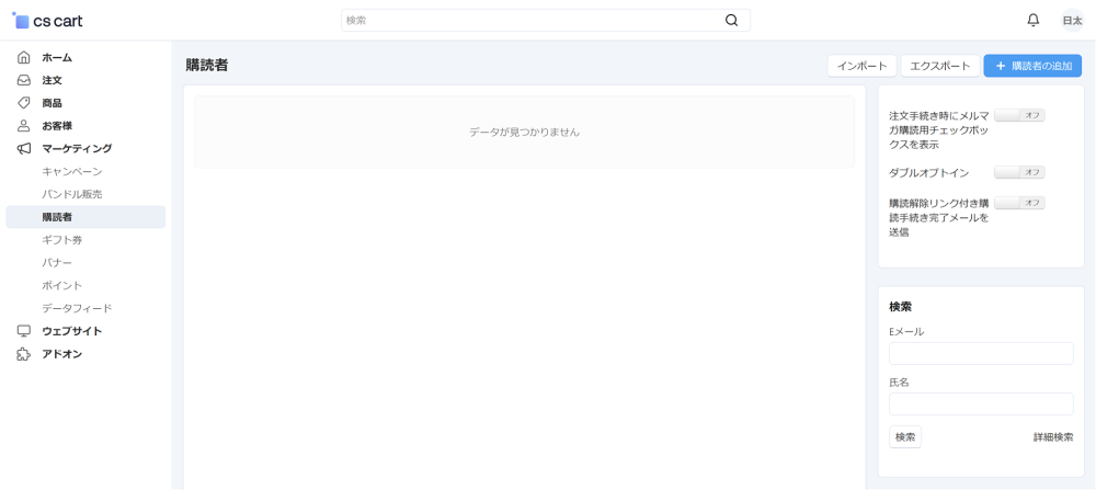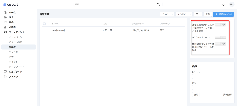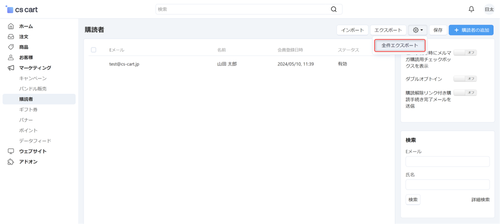 管理画面の マーケティング → 購読者 からメルマガの購読者を管理できます。