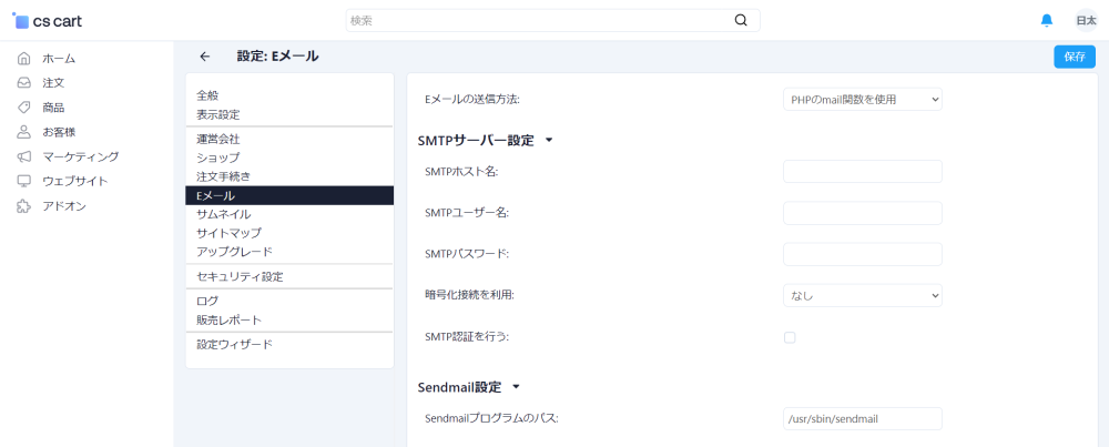 | Eメールの送信方法 | CS.Cartから送信されるメールを サーバーのどの方式で送信するか選択することができます。 ・SMTPサーバーを使用 ・PHPのmail関数を使用(デフォルト) ・sendmailを使用 |