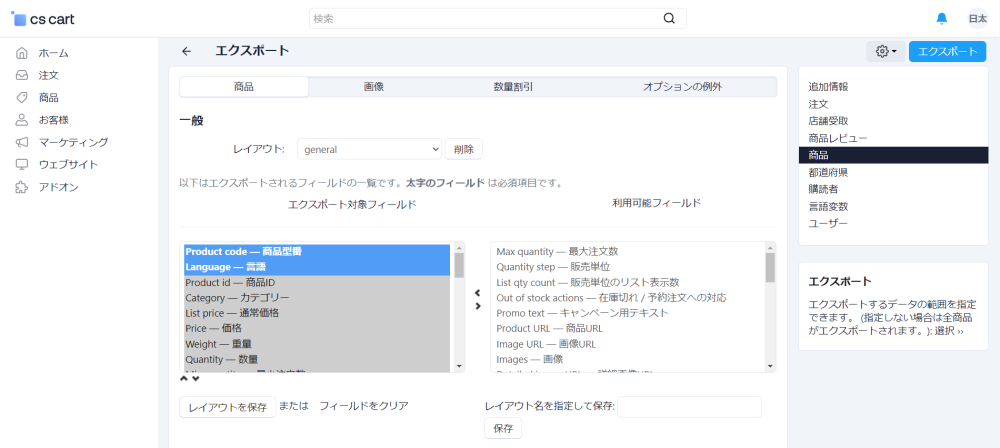 エクスポートは、CS-CartのデータベースからCSVファイル形式でデータをエクスポートする機能を提供します。