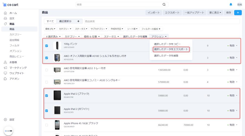 商品一覧ページよりエクスポート対象となるデータを選択します。