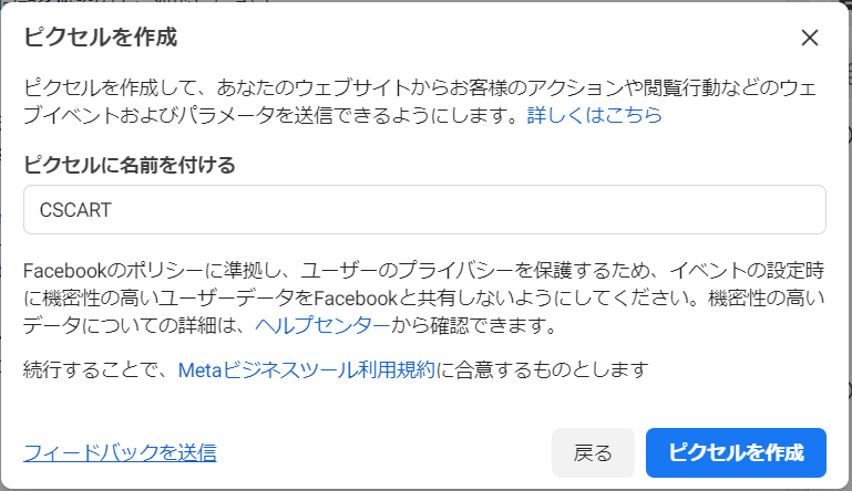 4. 「ピクセルに名前をつける」に名前を入力して「ピクセルを作成」ボタンをクリックします。