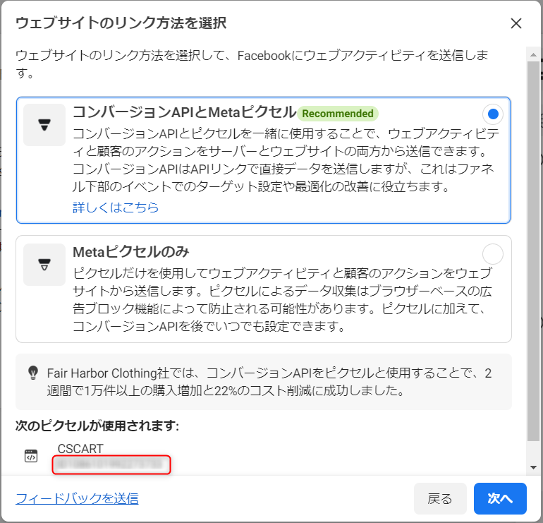 6. 「コンバージョンAPIとMetaピクセル」を選択して「次へ」ボタンをクリックします。