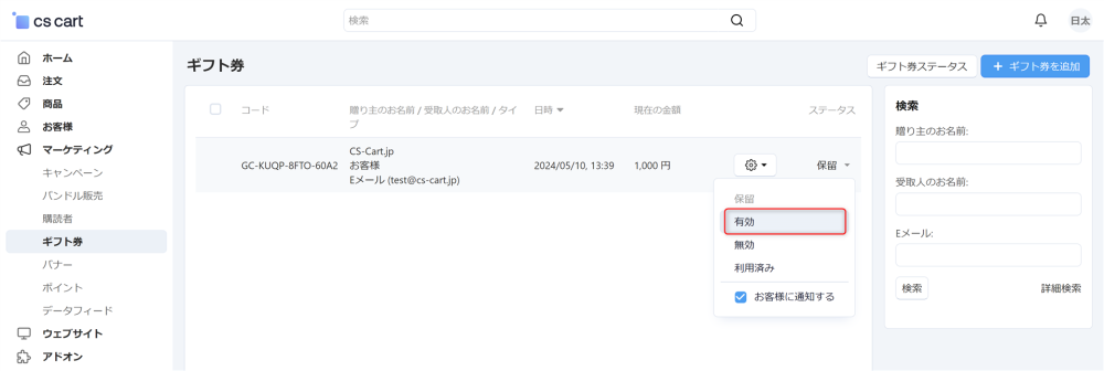 発行したギフト券はステータスを『有効』にすることでお客様に通知されます(Eメールを選択時)