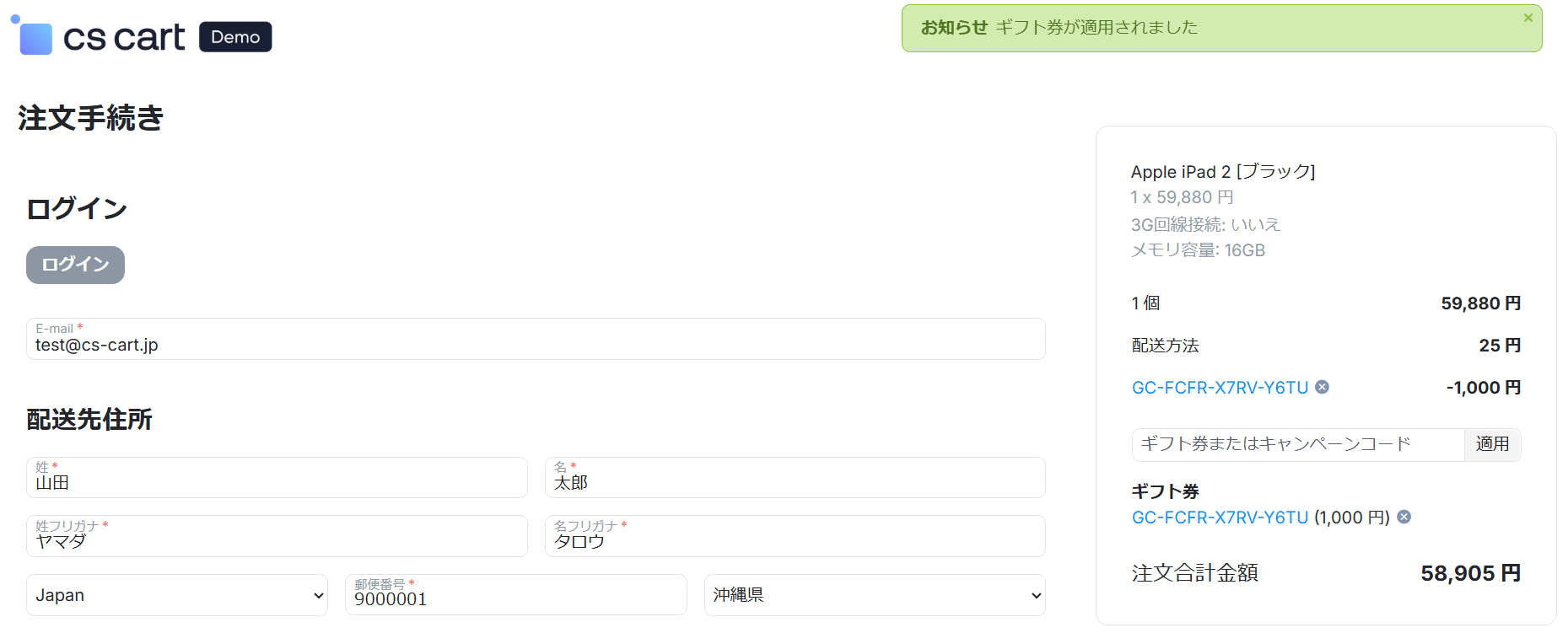 「カートの内容」ページまたはご注文手続き画面の「注文の概要」でギフト券コードを入力することにより、ギフト券を利用することができます。