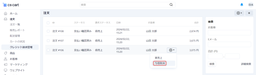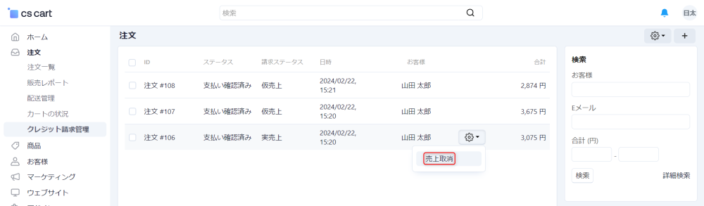 注文 → クレジット請求管理 にアクセスし、売上を取り消したい注文にカーソルを合わせると表示される歯車アイコンをクリックし、さらに 売上取消 をクリックすることにより売上取消処理を実行できます。