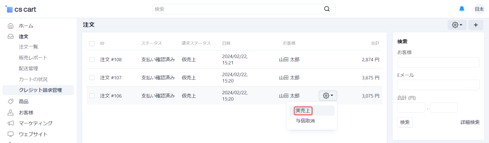 注文 → クレジット請求管理 にアクセスし、売上を計上したい注文にカーソルを合わせると表示される歯車アイコンをクリックし、さらに 実売上 をクリックすることにより実売上処理を実行できます。