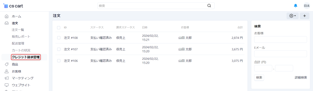 注文 → クレジット請求管理 にアクセスすることにより、omise(カード決済)を利用した注文の取引状況を確認できます。