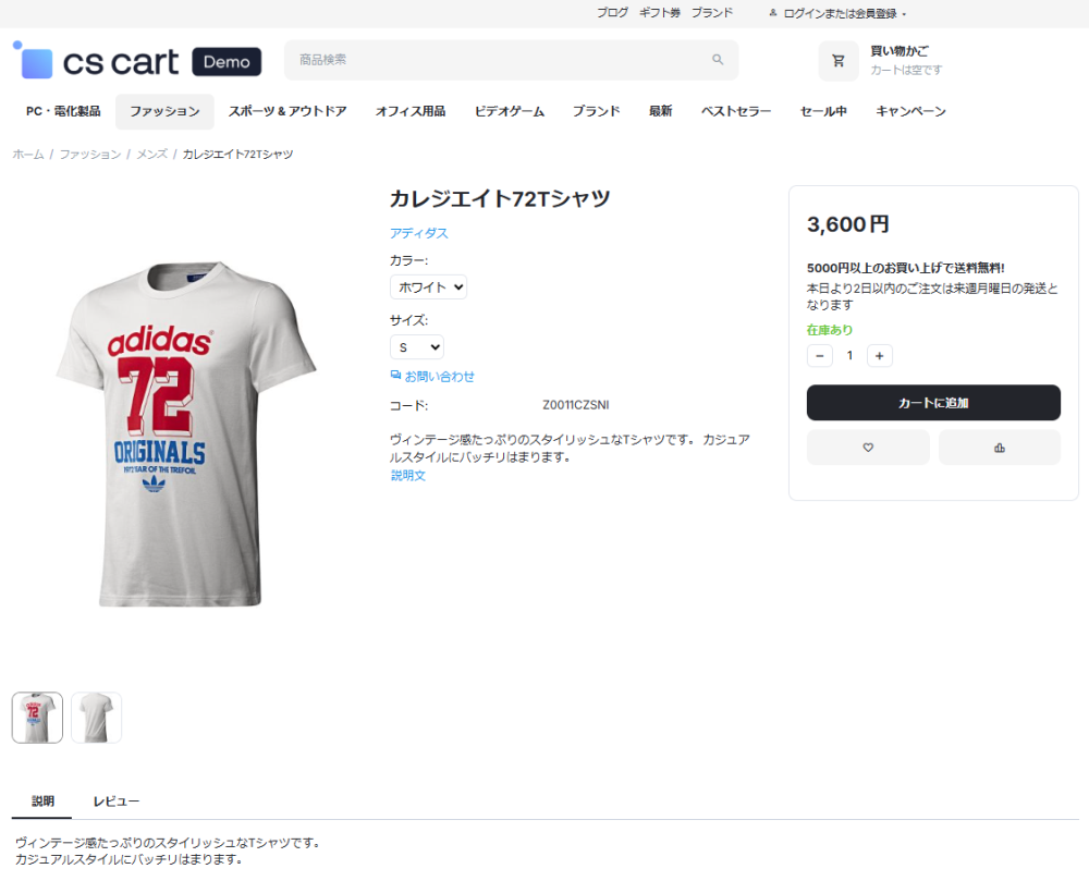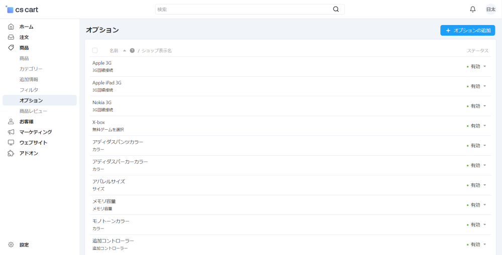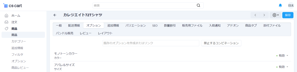 「オプション」を使用すると、商品のカラーやサイズを管理できます。