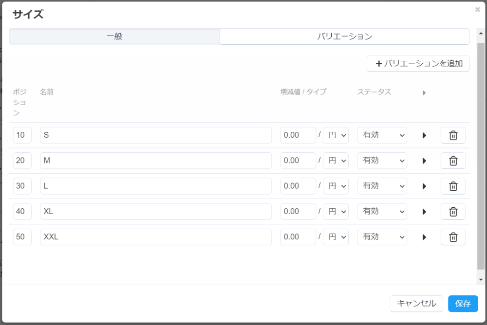 オプションのタイプを セレクトボックス 、 ラジオボタン 、 チェックボックス から選択すると、それぞれの値を「バリエーション」として登録することができます。