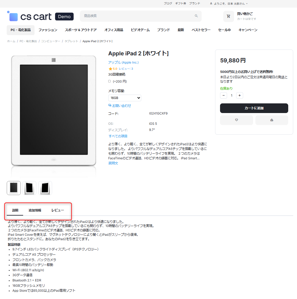 商品詳細ページにて説明文や追加情報などを表示するタブの部分です。 設定によりタブ形式ではなく、これらを縦に並べて表示することも可能です。