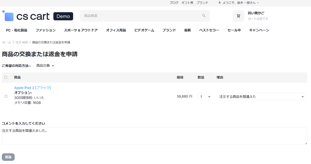 必要な情報を入力後、「返品」ボタンをクリックすると返品申請が完了します。