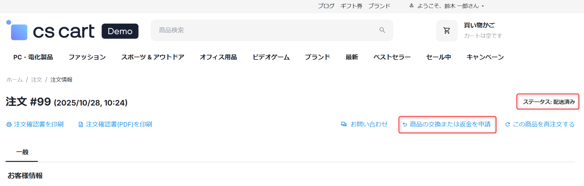 ステータスが「配送済み」となっている注文についてのみ、その下に「商品の交換または返金を申請」のリンクが表示されます。