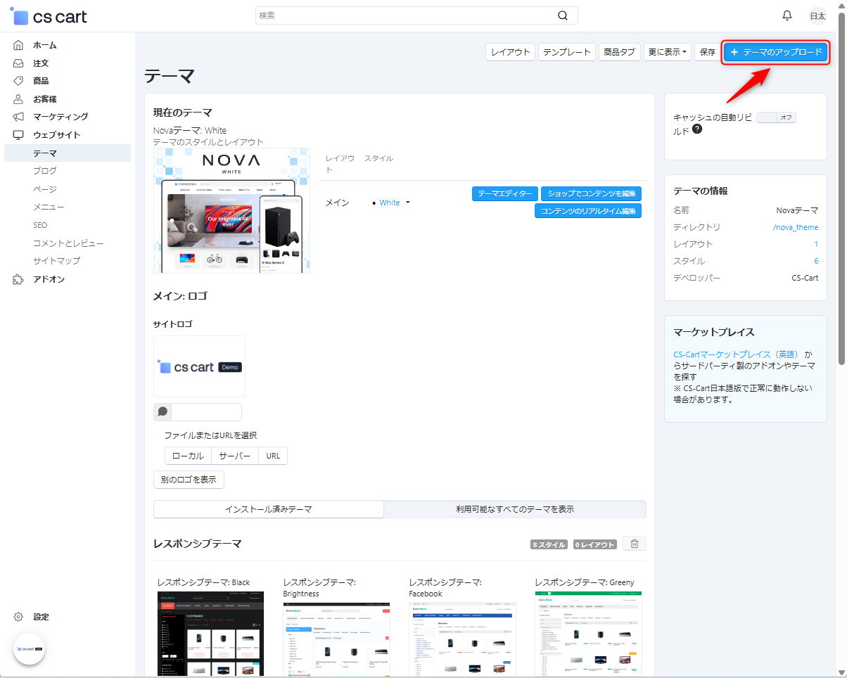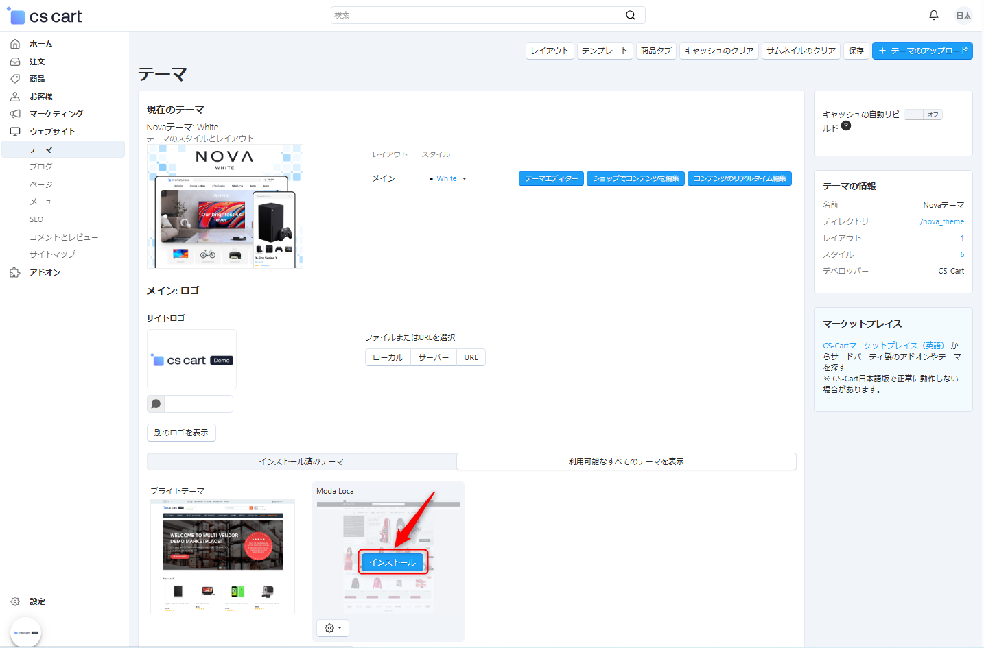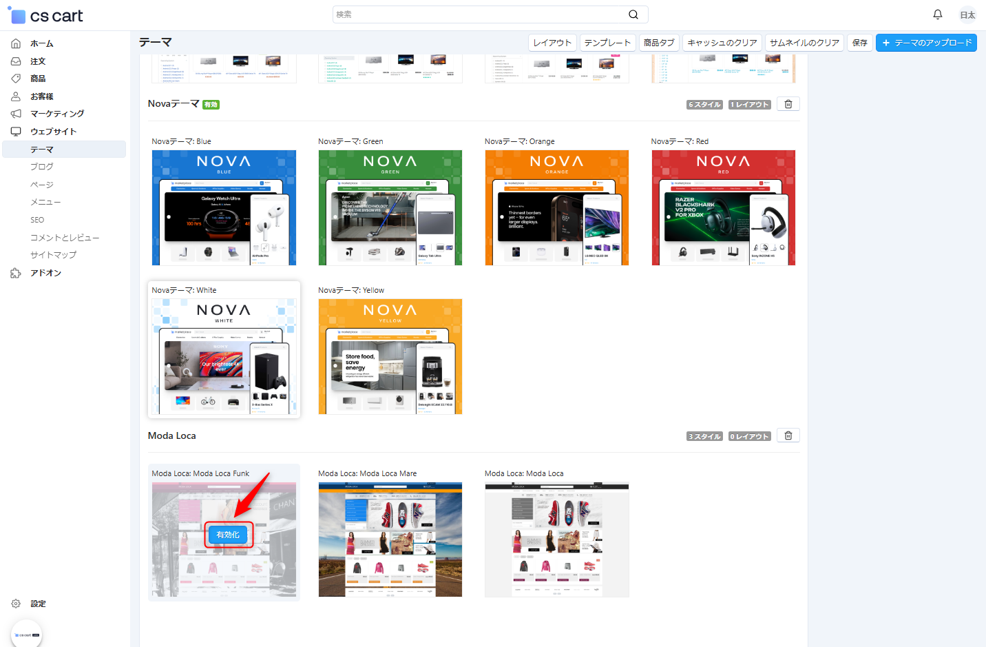 インストール後のテーマを「有効化」することでショップフロントに適用されます。