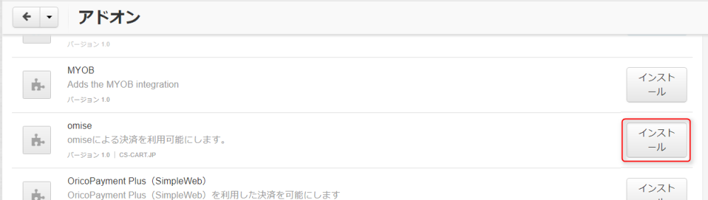 アドオンのインストールが完了したら、 アドオン → アドオンの管理 → omise にアクセスし、以下の項目を設定してください。
